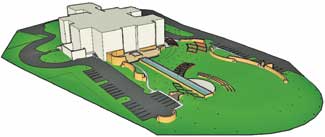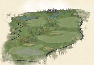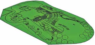 The two final tools in the SandBox allow you to add other information to an existing contour model. The Drape Tool allows you to add two dimensional objects to three dimensional surfaces. This is particularly useful when adding roads, parking, rivers, and lakes to existing topography. Once the site design is inserted, you can easily develop the model (see images below). Golf course fairways and putting greens are easily dropped in and become realistic objects when rendered (see image below). The example below shows this feature. The Stamp Tool allows you to create an imprint of an object onto the surface of the model. Once its position is established, you can move the object up or down depending on whether the object is above or below existing grade. Using the Soften/Smooth Edges tool you can visually blend the topography to meet fixed objects.