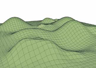 There are two ways to create terrain when using the SandBox. The From Scratch Tool creates a grid of triangles or Triangulated Information Network (TIN) that allows easy manipulation of hills and valleys. Once a TIN has been created, the Smoove Tool allows for quick manipulation of terrain to represent hills and valleys (see figure below). It is not intended to be a realistic model of real topographic information, but rather a schematic design tool to see grade relationships in three dimensions. If greater accuracy is desired, the From Contours Tool allows you to quickly turn existing topographic information into a three dimensional model. This tool allows you to cover imported contour information of actual site conditions. Once a TIN is created, adding detail to berms and hills or removing unwanted flat areas in terrain models can be accomplished with the Add Detail and Flip Edge tools. Each tool allows you to manipulate individual faces that make up the terrain model.