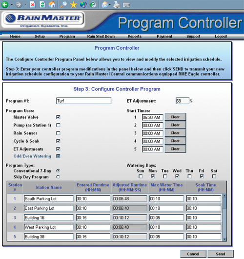 Users may setup their system, so that weather information is automatically sent to each controller every day.?????EUR??,,?EUR Upon receipt of the weather information, the controller modifies scheduled station runtimes.?????EUR??,,?EUR The Web site may also initiate a ?EUR??,,????'??rain shutdown?EUR??,,????'?? to each of the controllers if it has determined that precipitation necessitates a shutdown.