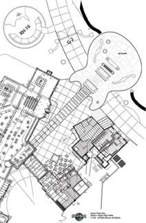 To make it happen, Hard Rock Park?EUR??,,????'???s official guitar sponsor, Gibson USA, provided the actual CAD/CAM files used to manufacture the guitar. McCurdy imported the files into Vectorworks, scaled them up ?EUR??,,????'??+ a lot ?EUR??,,????'??+ and began tweaking the scale and orientation of the guitar and adjacent buildings in his master plan design. The guitar provided the perfect shape for the space. The guitar body cantilevers over the lake, creating the perfect gathering space and temporary concert venue. The pickups in the guitar became a pop-jet fountain, and the guitar neck leads exiting guests into the main exit-retail store, where the guitar head becomes part of the interior floor pattern. For those who might be thinking, ?EUR??,,????'??you could only see that from an airplane,?EUR??,,????'?? you can, indeed. Passengers on the left side of planes arriving on final approach to Myrtle Beach International Airport can see the park and its Guitar Plaza ?EUR??,,????'??+ a high-rolling gathering point that will have fans talking for years to come.