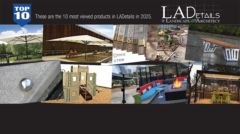 Take a look at the most-viewed products on LaDetails in 2025, including umbrellas, decorative trench drains, solar charging stations, play elements and more! Click the link under each product to find out more directly from the vendor. 1. FiberBuilt UmbrellasVenice Umbrellatinyurl.com/lasn-2025-FiberBuilt2. Shadescapes AmericasMay Albatros Umbrellatinyurl.com/lasn-2025-Shadescapes3. Trench Drain SystemsBronze & Aluminum Gratingtinyurl.com/lasn-2025-Trench-Drain-Systems