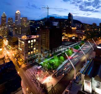 The new Place des Festivals, Montreal, dusk. Shown here: the ?EUR??,,????'?????<?Dynamite Blast?EUR??,,????'?????<???EUR? feature by Crystal Fountains at the center of the park?EUR??,,????'?????<???EUR?s interactive fountain displays, climbing up to 30 feet in height. Crystal Fountains submersible LED lighting technology was used to illuminate all the fountain jets in the square, from ground to full water height, creating additional drama and visual excitement.