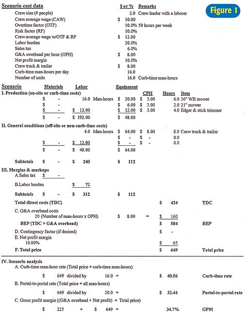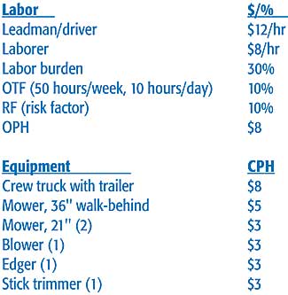 Editor?EUR??,,????'?????<???EUR?s note: This article was condensed from James Huston?EUR??,,????'?????<???EUR?s book and audio book, "How to Price Landscape & Irrigation Projects", released in July 2003. The author is president of J.R. Huston Enterprises, Inc., which specializes in construction and services management consulting to the Green Industry. Mr. Huston is a member of the American Society of Professional Estimators and is a certified professional landscape estimator. The monetary figures in this article are based on 2003 dollars. According to inflationdata.com, the rate of inflation from Jan. 2003 to Jan. 2006 was 9.14 percent. Pricing landscape maintenance crew and equipment packages poses some unique challenges. The lawn maintenance package approach is normally used to price residential jobs of short duration. We?EUR??,,????'?????<???EUR?ll basically average our costs for the day and then calculate an hourly, daily and per minute price. This is valid as long as the crew is working on a project that falls within our average job scenario. Once the crew starts to work outside this ?EUR??,,????'?????<?normal?EUR??,,????'?????<? job scenario, cost accuracy suffers. Main point: The lawn maintenance package approach is normally used to price residential jobs of short duration. The day rate for the crew is a critical number for everyone to keep in mind. This is the amount this crew has to bill every day in order to cover all costs and be profitable. The day rate is a goal the crew, managers and owners should strive to meet every day of the season. If it?EUR??,,????'?????<???EUR?s achieved, you can virtually guarantee you?EUR??,,????'?????<???EUR?re making money on this crew. The minute rate is also important, because it allows you to quickly verify that your jobs are priced correctly. Multiply the amount of minutes the crew is on the job site by the minute rate. Compare this calculated amount to what you?EUR??,,????'?????<???EUR?re charging the customer. If they?EUR??,,????'?????<???EUR?re not equal, make adjustments if at all possible. We?EUR??,,????'?????<???EUR?ll follow a three-phase format, (below) but instead of using it for one specific job, we?EUR??,,????'?????<???EUR?ll enter the costs for one generic day of work. 1. Calculate Phase I production costs. 2. Calculate Phase II general condition costs. 3. Markups and margins are added in Phase III in order to arrive at the final price, either in lump sum or unit price formats. This three-phase format is excellent for bidding specific large residential and commercial projects, those billing over $500 per month (or which include more than 15-20 man-hours per month). However it?EUR??,,????'?????<???EUR?s impractical and too time-consuming for pricing smaller jobs. Using the maintenance package bidding approach for smaller jobs greatly speeds up the estimating process, without sacrificing accuracy.