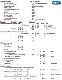 Note: The costs used in our scenarios are for illustration purposes only. Your costs will vary from the ones used in these examples. The key is for you to build a typical one-day scenario for the different crew, materials and equipment mixes you use. Round up these rates as appropriate. If your costing structure is accurate, the rates you calculate should be very close to your current ones and to those generally seen in your market.