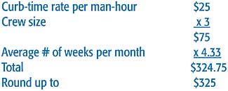 For instance, one contractor in Southern California charges clients $325 per month for a three-person crew being on the site for one crew hour per week. If his crews spend more than one hour per week on a site, he knows he?EUR??,,????'?????<???EUR?s in trouble on that job. The arithmetic works out as follows: