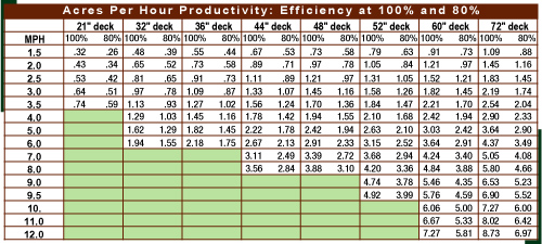 From the standpoint of efficient business practice, we’d like to suggest that you take a look at the productivity chart before you begin. This chart, courtesy of eXmark shows you the efficiency rates of mowers with different sized mowing decks. Two productivity ratings are shown, one at 100 percent and one at 80 percent efficiency. Many manufacturers use 100 percent efficiency ratings for sales purposes. EXmark believes that an 80 percent efficiency rating may be more representative of actual mowing conditions since it allows for turns and overlapping. We’ve put it here to give you an idea of how to calculate which size deck is most efficient for your various jobs. If taking man hours into consideration, it might help a contractor calculate what his needs are, and how to most effectively spend money on new or upgraded equipment.