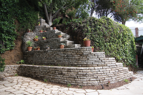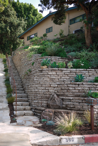 La Loma Development set out to replace a collapsing block wall in this Pasadena, California project. By the end, they fixed the property's erosion problem, planted ivy, and replaced an asphalt driveway and poorly designed stairs with dry stacked urbanite.