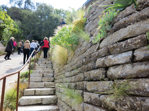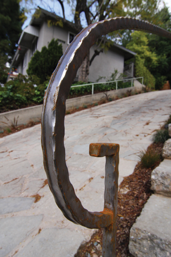 The driveway was constructed using urbanite, which was set in reinforced mortar. The 59-foot staircase was also built with urbanite steps. A railing specialist then welded the rolled-metal railing that runs up the driveway length. The steep slope was re-graded and the existing asphalt driveway was widened and replaced with recycled concrete paving.