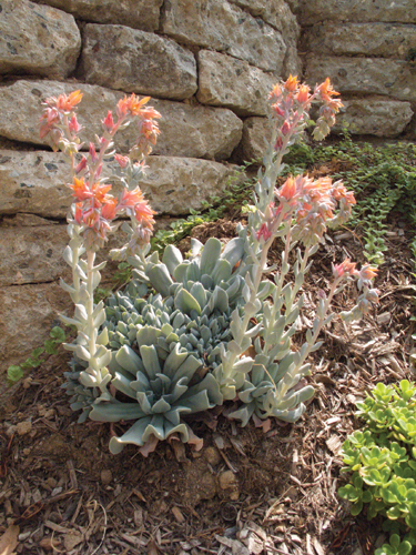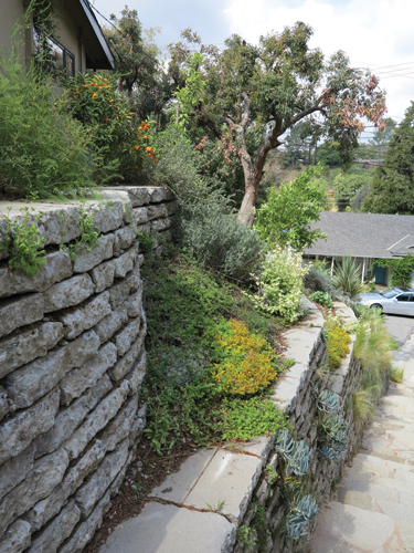 Landscape To soften the rock look, and as for erosion control, the contractor planted native grasses, sages, yuccas, yarrow, as well as succulents such as dudleya and sedums, and edibles such as artichoke, oregano, rosemary, citrus, blueberries, asparagus, other vegetables and herbs. Before planting, the company laid down more than 40 cubic yards of mulch and 20 cubic yards of compost as well. Over all, they used 200 1-gallon plants, 75 5-gallon ones, 30 15-gallon plants and flats of ground cover. The irrigation is controlled by a smart weather irrigation controller. The company filled out the landscape with a mix of different plant material, including edibles that are exposed to full sun on a hillside. They also added Senecio mandraliscae, Sedum angelina, Helichrysum petiolare 'Limelight', Stipa tenuissima, Lavandula sp., and citrus trees. Finished in Six Months Taking 12 workers six months to complete, the project features more than 7,500 square feet of recycled concrete paving, base aggregate, 2,600 square feet of Filter fabric and 200 linear feet of 4-inch diameter drainage pipe.