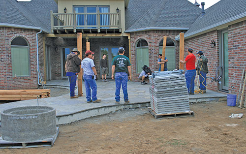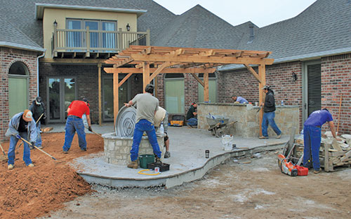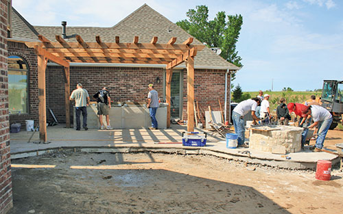 Before the concrete was poured, water, gas and electric lines had to be set in the foundation, and because of the size of the patio, drain piping had to be installed for area drains. Once the new concrete patio was poured, the new and existing concrete patio were covered with natural flagstone, combining the two areas into one large patio, which helped make it an extension of the home, giving the appearance that the entire area was part of the original home design, not an afterthought.