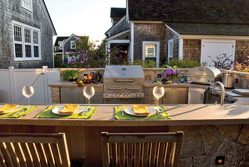 Drive out of the town of Nantucket, past landmark buildings and the harbor, down streets cobbled with stones, and out into the country side and you will find one the most elegant, functional and inviting outdoor kitchens. Designed by Kris Horiuchi of Horiuchi-Solein in Falmouth, Mass., the kitchen is built and located to serve the unique entertaining needs of the family. The open end, facing the pool, spa and screened dining area, gives everyone easy access to its refrigerator, freezer, ice maker, hybrid fire grill and cook tops.