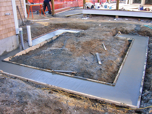 After the wall footings were placed, Damian's team then began laying in a permeable sand base. ''It's important to get the water out in a location like Nantucket. The drier things are here the more stable they are,'' said Damian. His team poured in 3 to 6 inches of sand, compacted it and added more, compacted it again, repeating the process until they reached the prescribed level.