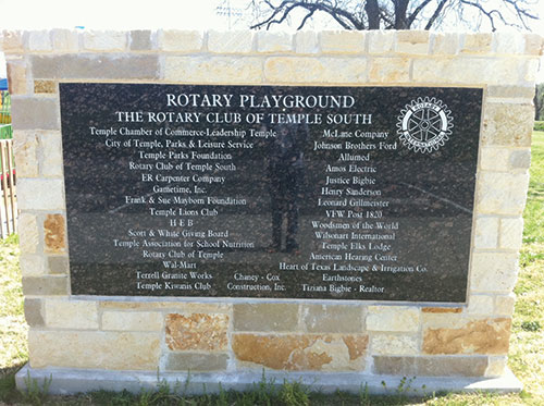 The playground was designed to provide play opportunities for children with mental and physical disabilities. Heart of Texas Landscape & Irrigation Co., Inc. donated $6,000 worth of irrigation (Rain Bird), sod, trees, ornamental grass and shrub installation, in addition to Pamplin & the Leadership Temple group making the playground a reality through fund raising and countless presentations.