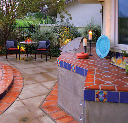 The fire-pit is located on an elevated patio away from the dining area and adjacent to the counter-bar. The dimensions of the fire-pit are four-feet in width by six-feet in length, it is constructed of CMU block, with a smooth plaster finish. Also used in the construction are 12-inch Saltillo tiles, hand-painted Mexican tiles and less expensive coordinating blue tiles to help offset the cost. The fire-pit is fueled by gas, which is run underground to the gas meter. The barbeque is a gas and electric Twin Eagles 30-inch grill with rotisserie. The materials used in the construction of the counter-bar are the same as the fire-pit, however the Saltillo tiles were cut into four-inch squares to fit the design of the counter-bar.