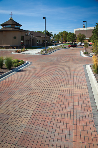 St. Augustine's reviewed a variety of permeable and porous pavement systems before choosing Pavestone Eco-Priora. Coupling the front end costs with life-cost analysis, the church decided Eco pavers had the better package according to Ken Anderson, business administrator for St. Augustine Catholic Church. Furthermore, they opted to utilize Pavestone's new Platinum series, which added additional vibrancy and greater color variation. Permeable concrete paving stones have been used in Colorado for a number of years. In areas that experience large stormwater volume, permeable paving stones help control runoff, mitigate storm surge and improve water quality. The unique Eco-Priora joint profile allows surface water to infiltrate into the pavement and its sub-layers. With initial permeability average flow rates of over 100 inches per hour, the Eco-Priora product will still meet the majority of current stormwater management plans.
