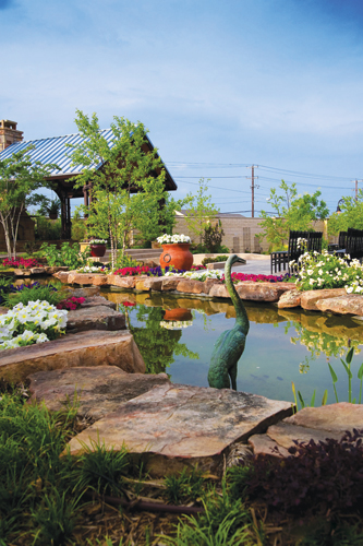 The Garden's major element is a water feature imitating a natural rock lined creek. Installed by Bob Weaver Pools, the pond is actually three ponds constructed of steel reinforced concrete. Two weirs separate the three pools. Weaver placed stones on top of the weirs to allow the water to fall between. Water plants, fish, and wildlife sculptures adorn the pools, and landscape plants border the pond edge.