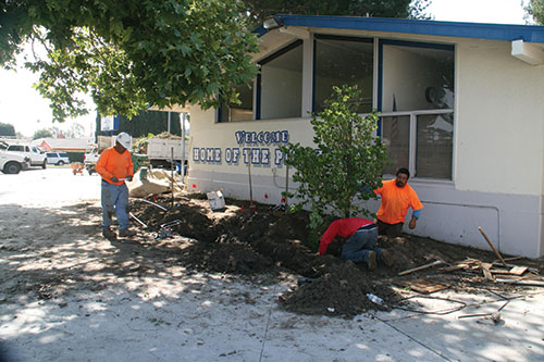 The contractor developed landscape plans that utilized the Anaheim School District's new plant palette, and the Marina Design Group Irrigation Specialist designed a new, efficient irrigation system to keep the plants and trees green and healthy.