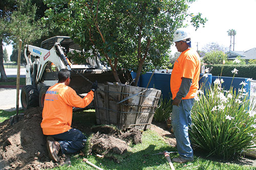 On June 19, 2010, the company's field and office crew arrived at the school with a team of more than 20 landscape professionals to start demolition. Trees, shrubs, ivy and concrete were removed from the site to make way for the new landscape. Marina poured new concrete mow strips to minimize turf areas, which will cut back on maintenance and water costs for the school. New high-efficiency nozzles and new sprinkler heads were donated by Hunter Industries and installed by Marina. Boulders were relocated to make the front entrance aesthetically pleasing, and planting areas were prepared.
