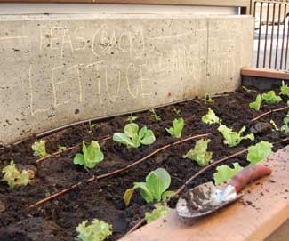 Early this October, children from nearby Marshall Elementary School planted a variety of edible plants including lettuce, onions, garlic, chard, beets, strawberries, cilantro, and peas and learned about the importance of mulching and other gardening techniques.
