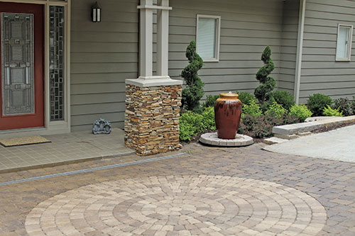 Smith and his team installed 1,400 square feet of Pavestone's Venetian Stone?EUR??,,????'?????????????? Tumbled in Chattanooga Sandstone with a Plaza IV Circle pack in Mocha. The pavers were sealed with SEAL'nLOCK's Super Wet, a user-friendly and environmentally safe water-based pure urethane sealer that penetrate pavers and provides a protective barrier over pavers to produce a clean, wet look. The pavers transformed the base of the driveway into a grand entryway and focal point for the front of the home.