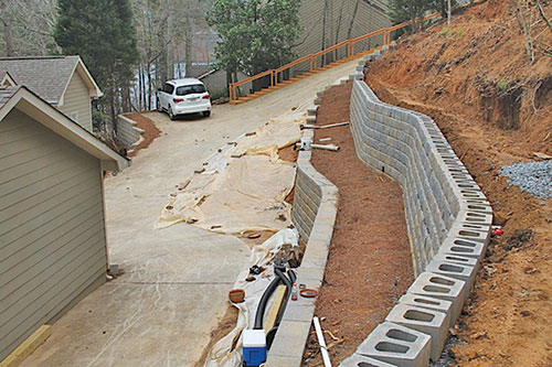 As featured on PBS's GardenSmart, the original project was small: the homeowners wanted some cross-tie walls removed from their property and replaced with a more sustainable solution. Smith and his team put together a bid for a modular block retaining wall and went to work, but the Georgia job quickly outgrew even Smith's greatest expectations. After the first walls were installed, the Kobels were so pleased that they planned other projects including: electing to remove additional sets of cross-ties along the long, sloping entrance to their home; widening their driveway to twice it's original size; excavating land to create more parking; and building a three-tiered retaining wall to create more usable space on their property. The relatively simple original project had developed into a vision for a complete outdoor remodel.