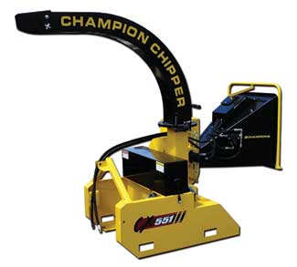 Model No.: Champion Chipper CX551 Engine: 3 Point Hitch, PTO Drive Chipping Capacity: 5” Feed Opening: 28” X 28” Weight: 775 lbs. Special Features: 3 Point Hitch PTO Drive ; High Speed 1700 RPM rotor requiring less HP to operate while throwing the chips 10-15 feet farther than direct drive models ; Easy to remove shields access the 3 cogged v-belt drive ; 360 degree chip chute rotation ; 4 reversible knives mounted with recessed bolts (no threaded knives) Accessories: Hydraulic feed ; 20 HP Highway permissible, tow behind engine drive model ; Trailed PTO option available Warranty: 1-yr. Cost: $5250.00 MSRP