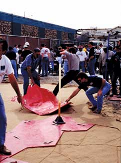 Large tools, such as 5-foot by 5-foot mats, are easier to work with and more efficient, as they can stamp a substantially greater area at once. This reduces the number of times the mat must be moved and assembly is also simplified compared to smaller, more intricate stamp designs.