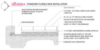 Once the compacted subgrade has been prepared and the compacted base material put into place, use one inch of coarse, concrete sand screeded smooth. The brick is then laid in place according to the pattern that will be used, with gaps of 1/8-inch (+/- 1/16-inch) between each brick. Proper joint width ensures that each paver will effectively interlock with pavers next to it. Edge restraints are put in place and concrete sand is then swept into the joints.