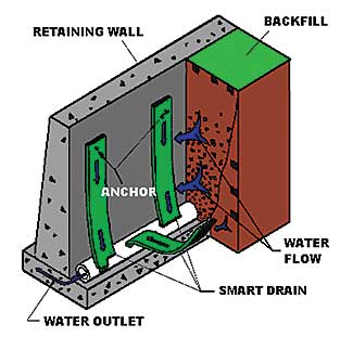 One of the main causes of retaining wall damage is excessive water buildup. Whether it is a simple retaining wall of wood, stone, or brick or a large complex retaining wall of concrete, water damage is an ever-present danger to the walls integrity. Water pressure can crack and deform retaining walls leading to costly repairs and in some cases replacement. From a landscaping perspective, when a belt is installed vertically in the soil, it simulates the capillary action of tree roots by drawing down surface rain water and holding it underground. When placed horizontally beneath vegetation, the capillary action of the belt can be used to deliver irrigation water to the roots. When embedded horizontally below ground, with a slight slope, the siphoning action of the belt drain can be used to keep soil and construction foundations dry.