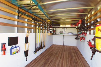 Hand and Power Tool Storage System: Inventory your tools in one minute flat. Prevent breakage and loss using this system which allows you to organize and safely store these items: string trimmers, stick edgers, pole pruner, eight-foot step ladder, back pack sprayers, two-gallon hand sprayers, shovels, rakes, broom, back pack blowers, loping shear, scissor shear, power gas shear, multi-shaft power tools, pesticide containers, clip board, water cooler, spool of string for trimmers and more.