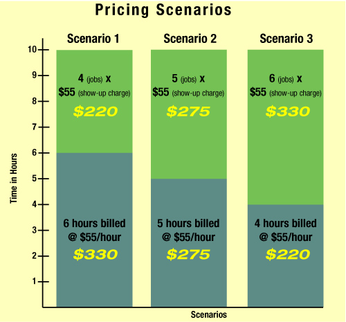 In our example, I’d charge $55 to show up, knowing the average job was 20 minutes from your office/yard and required approximately 10 minutes of additional off-site time for loading the truck, etc. The trip-charge rate would include these 30 minutes, plus the first 30 minutes of time on the job. Additional time on the job would be charged out at $13.75 per 15-minute increment or part thereof.
