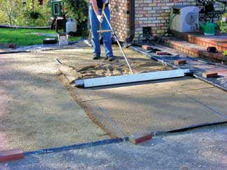 After the base material is spread out and raked smooth, compact the first lift by starting around the outside and work in circles toward the center. Always overlap each pass by half the plate compactor?????s width. Repeat this a second time, again starting on the outside. After the second compaction is complete, start compacting back and forth and diagonally. When finished with the base, it should be very smooth and flat. If you were to put a straight edge flat on the surface, there should be no more than 3/8” (1cm maximum) gap anywhere along the straight edge and the base.