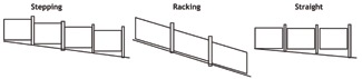 If the property is hilly, fence installation will have to be installed straight, racked or stepped. Racked means that the fence section gives so that the fence bottom follows the terrain. Stepped means that the fence bottom looks like stairs. Straight means that the fence is installed straight, leaving a gap under the fence which gets larger as you go downhill. Many times the homeowner has a preference of how they want the final product to look.