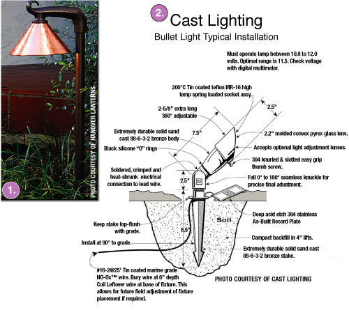 2. A detail drawing shows the exact installation and material specifications of a CAST MR-16 Bullet made of long-lasting, sand-cast bronze.