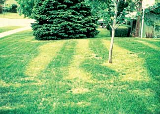 Apply fertilizer uniformly over the lawn. Overlap wheel tracks for drop-type spreaders. For rotary spreaders, apply the fertilizer so the wheel is at the edge of the pattern from the previous pass. Improper spreading of fertilizer will result in “streaking”, the alternate dark- and light-green stripes in a lawn. Agricultural type fertilizers (10-10-10, 15-15-15, etc.) that have large particle sizes should not be applied with a drop-type spreader; a rotary spreader should be used. Irrigation or rain following fertilization is important to move nitrogen off the leaf blades and into the soil. Some fertilizer/herbicide combination products cannot be watered-in, so be sure to read the label instructions. Avoid applying fertilizer to drought-stressed or dormant turf, or when temperatures are over 80oF.