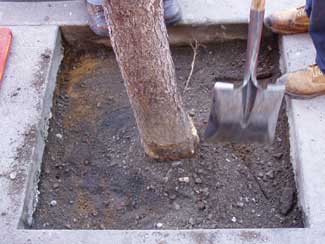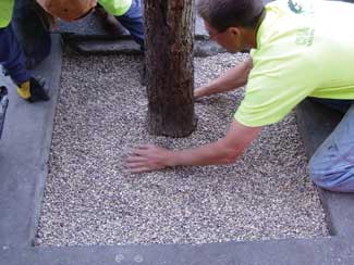 At the base of the tree trunk the loose aggregate should be funneled upwards to a depth of 3/8 to 5/8 inch below the finished grade. This area shall encompass diameter equal to the expected tree growth. This provides a weaker bond to allow the tree to grow unimpeded.
