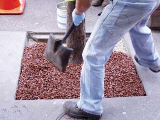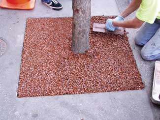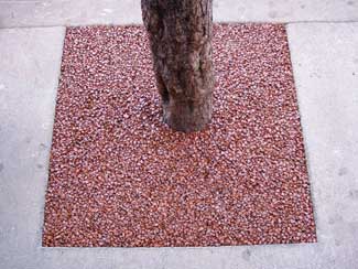 This tree pit system is designed to provide an attractive and aesthetically pleasing porous paving system, using a variety of natural or recycled aggregates. The binder is mixed with a suitable natural or recycled aggregate with a typical grading of 6 to 10mm.The open texture achieved provides a highly porous surface allowing the tree roots access to both air and water penetration. Since the installations are installed flush with the surrounding paving areas they have the added advantage of not becoming a litter trap that can occur with traditional tree grates. Although this tree grate material is not capable of supporting vehicular traffic, by using paver trays filled with the resin and aggregate, areas can be trafficked, subject to being applied on a suitable base.