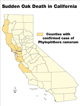 The task force had confirmed back in October 2002 the presence of the pathogen in at least 12 California counties. The infection may occur on the trunk and branches (cankers) or on leaves (leaf spot). Infection does not necessarily result in death of the plant, the task force points out; mortality occurs when the cankers expand in the truck.