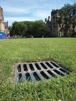 Also, every planter area requires a catch basin with an atrium grate installed. Atrium grates are domed to prevent clogging from debris and mulch that are often found in these areas. Ideal for applications where there is no traffic, atrium grates require less maintenance and handle more runoff water than a flat grate. Channel drains are recommended for driveways and patios to function as a roof gutter to collect the large volumes of water that flow across hardscapes. Finally, every downspout should safely discharge the water into a catch basin and away from the foundation of the house. By using a catch basin in downspouts instead of connecting the downspout directly to the drainage pipe, the catch basin prevents debris from the roof from entering and clogging the drainage system by catching it before it enters the drainage pipe.