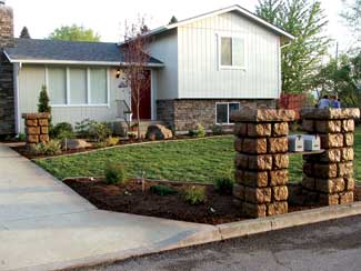 Members of the Landscape Turf Management Program from Spokane Community College came out and volunteered their time and expertise, helping in any way necessary and Concrete Works came up huge with a wonderful water feature that now resides in the backyard. The feature consisted of a freestanding bubbler surrounded by water, boulders and rocks. A third generation pine tree that had been in the Collins?EUR??,,????'??? family for years was preserved and planted amongst the sod, plant trees and flowers. Pre-cast steps were added and hybrid polymer cement bonded to the surface of the drive in order to finalize the yard that the family had never imagined would be their own.