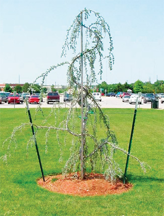 Most trees should be staked for only a minimum amount of time to let the tree develop maximum wood strength. With most trees, the ties may be removed after the first growing season. For large trees, two years of support may be necessary. Support staking is necessary for trees that aren’t strong enough to stand without support or trees that don’t return to the upright position after winds, snow or ice. It’s best to remove the staking as soon as the tree can support itself since all trees staked more than two years have a greater probability of breakage than those staked for shorter periods of time.