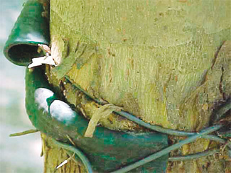 Trees may be more damaged and less able to support themselves because of rubbing or girdling from the stakes and ties, stress at the point of stake attachment or weakened down toward the base of the tree because trunk movement is required for optimum strength during development. Staking, as a result, is a cultural practice that requires a lot of maintenance for optimum benefit to the tree. If possible, avoid staking or guying trees. Small trees less than six feet tall or one inch in diameter shouldn?EUR??,,????'???t need staking. Larger trees may not have a root system or pot size sufficient to keep them from leaning or tipping. Watch them closely for a day or two after planting. If the plant stem at the soil line is moving excessively creating a crowbar hole larger than a quarter of an inch or larger than the stem of the tree, it probably needs support.