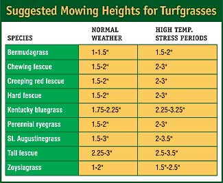 Not all grass is created equal. Mow at the highest setting recommended for various turf (see chart). The taller the grass blades are above the ground the deeper the root system is below ground. A large, deep network of roots helps grass plants withstand stress during drought and hot weather.