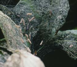 Later, in summer and fall, the fall webworm makes its presence known by constructing webs at the tips of branches. Hatchling fall webworm larvae make their first web on a single leaf -- the birth place of larvae as they hatch from eggs. As larvae grow, they engulf an ever-widening collection of leaves at the distal end of branches. In large colonies, webs can be almost a meter in length.
