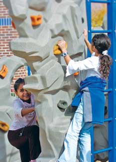 On the intermediate playground (top), a youth stands atop one of the sculpted boulders. The play surfacing for that playground and the swing area is engineered wood fiber. The primary playpit has poured-in-place rubber play surfacing (by Child?EUR??,,????'???s Play).