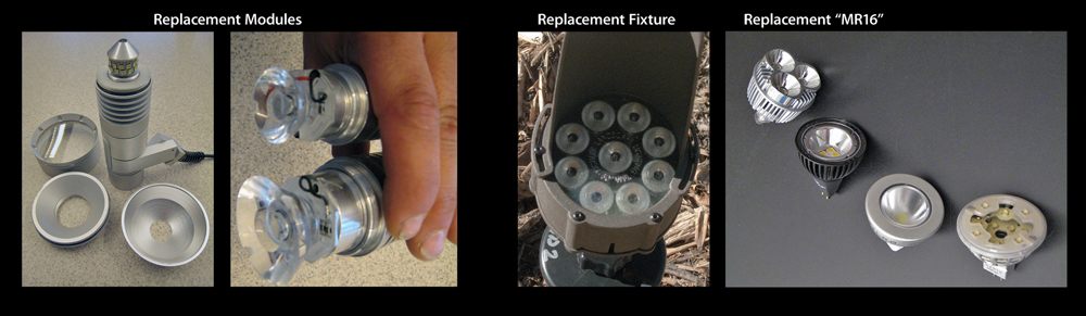 I would like to have a way to tune the wattages and change the amount of candle power, but as of now most fixture manufacturers are saying that will come over next couple of years. We can?EUR??,,????'?????<???EUR?t tune any LED sources in landscape fixtures today. If using LEDs, today we have two types MR16 LED type or replaceable modules. MR16 types are limited in wattage and beamspread. With the module approach one issue to consider is whether you will have to replace the entire fixture or if the fixture is set up to have an LED replacement module.