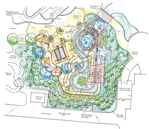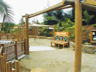 The design of the queue had to take into consideration the circulation of people as well as the capacity of the ride itself. It was necessary first to predict the number of people per hour the roller coaster could accommodate, then, with that number?EUR??,,????'??+100 guests per hour?EUR??,,????'??+the queue had to be designed to accommodate a 45-minute wait. That required a winding path snaking through the plantings around the pond. By the time the plantings have grown lush and thick, the feeling will be of navigating a jungle path. All the paths were paved with texture mats to intentionally replicate the cracks and declivities of an ancient forest path. ?EUR??,,????'??We also went around the park and got plants and fronds which we pressed into the wet concrete,?EUR??,,????'?? Richard Apel said. The three sand pits have been ingeniously designed to provide an interactive learning experience. Children ranging in age from two to 10, equipped with pails, brushes and shovels, are busy digging, brushing, hunting, measuring and locating teeth and claws that are seeded into the sand just waiting to be unearthed.