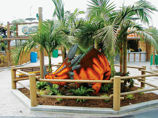 Intentional mounding surrounds Dino Island, not only separating it from other parts of the park, but creating a feeling of enclosure and timelessness. It also screens out activities relating to park maintenance that occur on the other side. The crest of the slope is all timber bamboo, Oldham bamboo and California redwood to complete the screening effect. ?EUR??,,????'??One of the issues we have with all the different plantings is making sure our irrigation systems meet the needs of each different plant,?EUR??,,????'?? stated Mr. Apel. ?EUR??,,????'??At Dino Island, a dual water system was required because the bamboos especially need fresh water, not recycled water which is high in salts. We?EUR??,,????'???ve combined traditional spray with both surface and underground drip systems. The palms are so invasive we needed to use surface drip systems in order to concentrate water at the root zone where it?EUR??,,????'???s needed most. That way we can also monitor surface drip hoses and move them out as the tree grows.?EUR??,,????'??