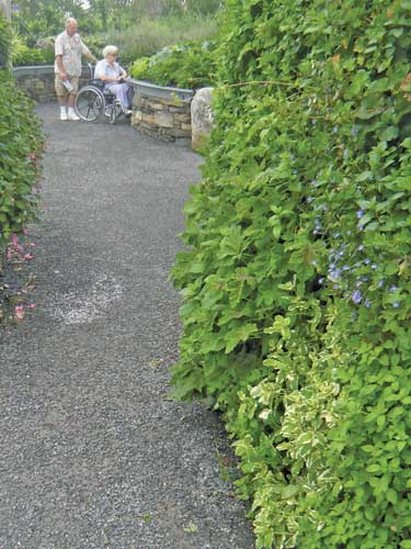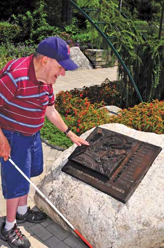 Entry to the sensory garden is through an archway covered in weeping larches and colorful, fragrant vines. Illustrated plaques welcome us and introduce us to the garden and its layout. Inviting plantings, cobblestone pathways, and finely crafted stone walls stretch before us. Visitors will notice a continuous ?EUR??,,????'?????<?striker stone?EUR??,,????'?????<? that borders the path and help those with visual disabilities navigate.