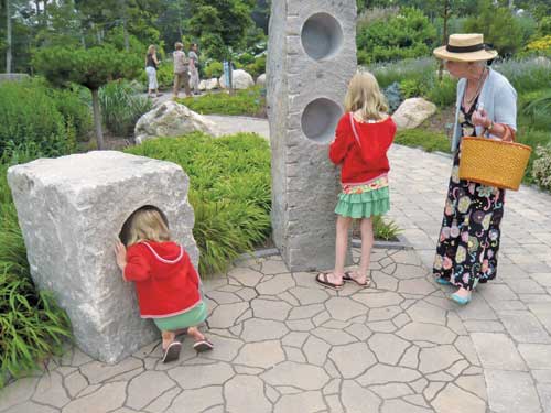 Touch - The centerpiece of this section is a classic labyrinth whose pattern is made of smooth stones in graduated sizes. If we take off our shoes, walking the labyrinth serves as a reflexology exercise. In the middle of the design is a boulder topped with moss. A large, flat-topped stone in this area is etched with a mini-labyrinth we can trace with a finger. We?EUR??,,????'?????<???EUR?re invited to touch textured plants and the water that surrounds us at several levels.